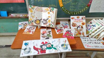 玄関ホールの給食献立黒板の前に本を用意しました。