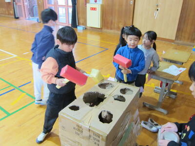 1年生 2年生から招待されました!(12月のようす) 投稿: ホームページ担当者 (12/10) カテゴリー: 1年生 本日の3時間目に体育館で2年生が考えたあそびやおもちゃを体験させてもらいました。 もぐらたたきやわなげ、UFOキャッチャーなど、楽しくあそびました。 次の時間にはおれいの手紙をかきました。えがおいっぱいの時間でした。