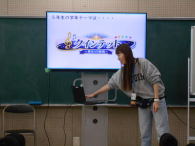 令和8年度が始まり、5年生は新たな学級・学年での生活をスタートさせました。いよいよ高学年となり、委員会活動も始まる中で、これからは学級や学年のためだけでなく、学校全体のことを考え、行動できる子どもたちへと成長していってほしいと願っています。そこで、「一人ひとりが自分も周りのことも大切にしながら、それぞれが自分の力を発揮してほしい」という思いを込めて、今年度の学年テーマを**「クインテット」**としました。