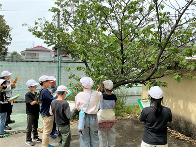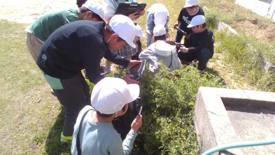 理科の学習では、指定された生き物や植物をタブレットのカメラ機能で撮影するフィールドビンゴを行なったり、桜の木を見にいって、どんな様子になっているのかスケッチしたりしました。「先生こんなんあったで!!」といろいろな春を校庭で見つけられました。
