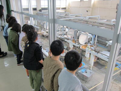 学校給食センターへ見学へ行きました。給食がどんなところで作られているかを実際に見学したり、できたての給食をセンターでいただいたりしました。自分の顔と同じくらいの大きさのしゃもじを見て、「いっしょにならんでみたい」と列になって大きさを比べていました。