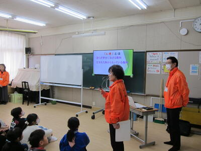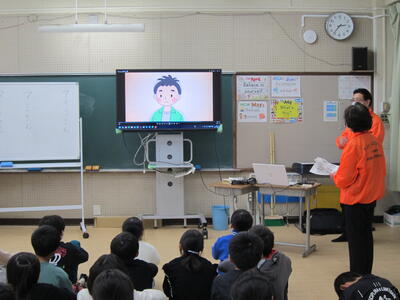 授業のはじめには、人権とは何か、わかりやすく説明していただき、そのあとは動画を視聴し、動画の内容について子どもたちの考えを聞きながら、人権で大事なことは何かを教えていただきました。