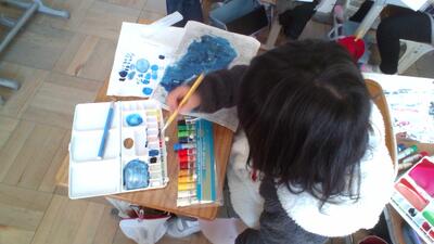 また、版画に絵の具で色付けをした作品も作りました。とってもよい作品ができました。